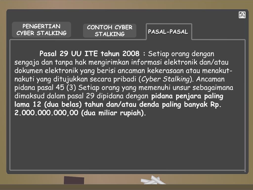 PENGERTIAN CYBER STALKING CONTOH CYBER STALKING PASAL-PASAL Pasal 29 UU ITE tahun 2008 :Setiaporangdengansengajadantanpahakmengirimkaninformasielektronikdan/ataudokumenelektronik yang berisiancamankekerasaanataumenakut-nakuti yang ditujukkansecarapribadi (Cyber Stalking). Ancamanpidanapasal 45 (3) Setiaporang yang memenuhiunsursebagaimanadimaksuddalampasal 29 dipidanadenganpidanapenjara paling lama 12 (duabelas) tahundan/ataudenda paling banyakRp. 2.000.000.000,00 (duamiliar rupiah).