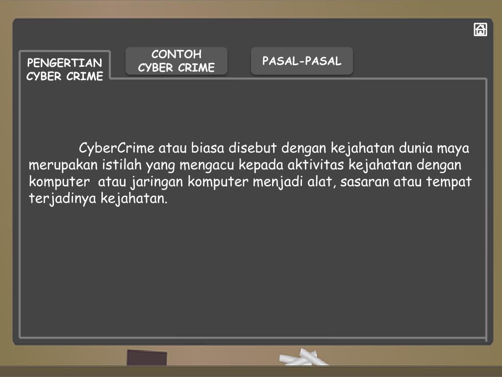 CONTOH CYBER CRIME PASAL-PASAL PENGERTIAN CYBER CRIME CyberCrimeataubiasadisebutdengankejahatanduniamayamerupakanistilah yang mengacukepadaaktivitaskejahatandengankomputerataujaringankomputermenjadialat, sasaranatautempatterjadinyakejahatan.
