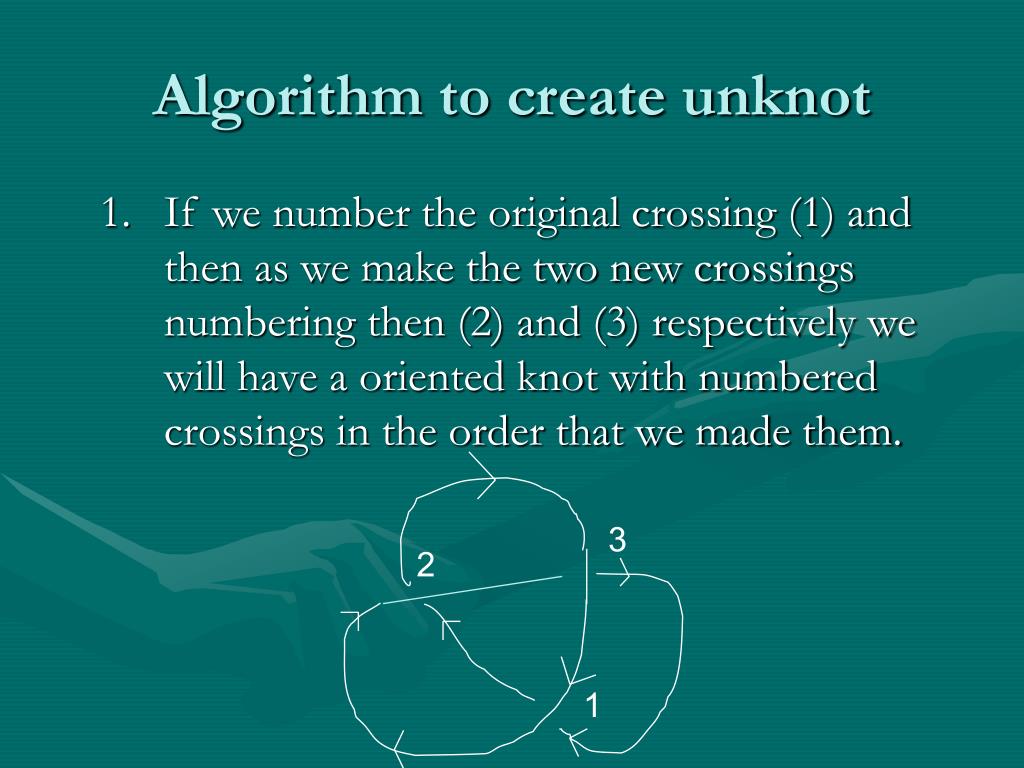 3 2 1 Algorithm to create unknot 1. If we number the original crossing (1) and then as we make the two new crossings numbering then (2) and (3) respectively we will have a oriented knot with numbered crossings in the order that we made them.