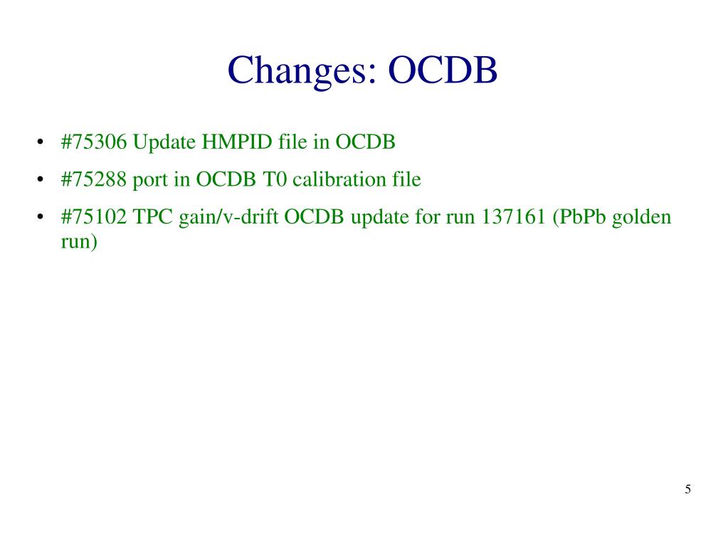 Changes: OCDB • #75306 Update HMPID file in OCDB • #75288 port in OCDB T0 calibration file • #75102 TPC gain/v-drift OCDB update for run 137161 (PbPb golden run)