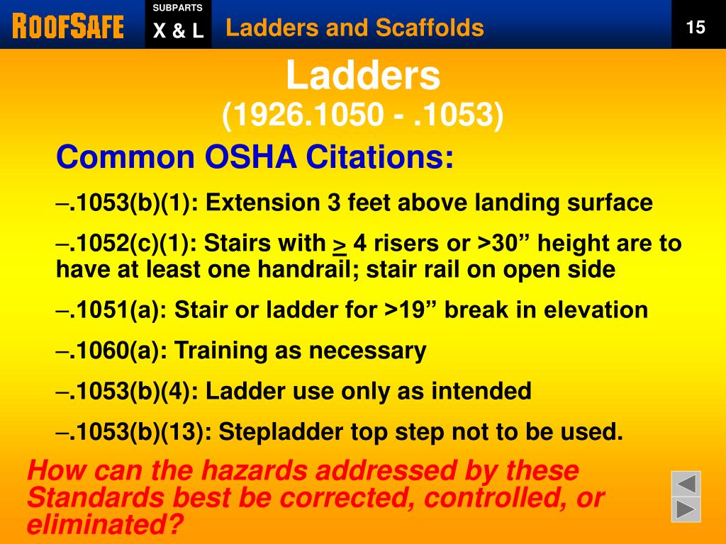 New England Roofing Industry Partnership. Ladders and Scaffolds. SUBPARTS X & L. Ladders and Scaffolds. 1. References. 29 CFR 1926.1050 - .1053, Subpart X - Ladders 29 CFR 1926.450 - .454, Subpart L - Scaffolds American National Standards Institute (ANSI). SUBPARTS.