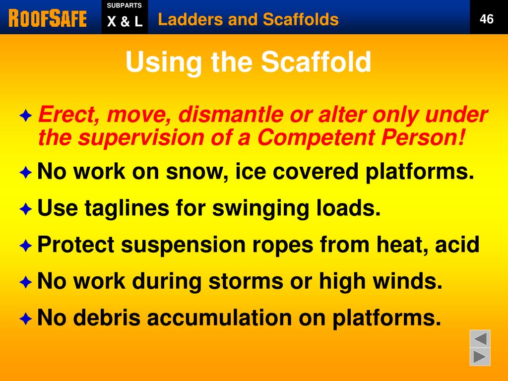 SUBPARTS Ladders and Scaffolds 45 X & L Using the Scaffold • No makeshift devices to increase height • The 'Drywall Bucket Rule' • No ladder to increase height except on 'large area' and: • Side thrust countered, platform secured • Ladder legs on same platform & secured • Platforms should not deflect > 1/60 of span