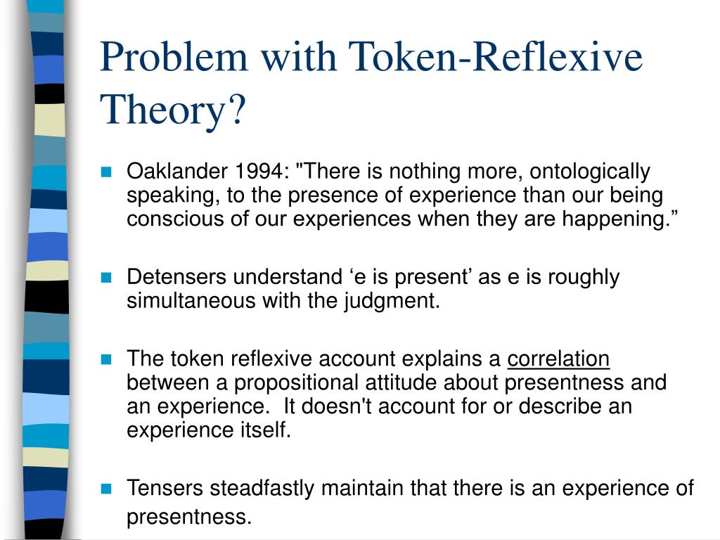 Problem with Token-Reflexive Theory? • Oaklander 1994: "There is nothing more, ontologically speaking, to the presence of experience than our being conscious of our experiences when they are happening.” • Detensers understand ‘e is present’ as e is roughly simultaneous with the judgment. • The token reflexive account explains a correlation between a propositional attitude about presentness and an experience. It doesn't account for or describe an experience itself. • Tensers steadfastly maintain that there is an experience of presentness.