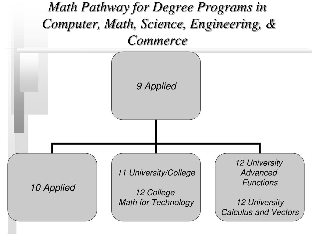 Math is Different • Crossing over from applied to academic in Math is not necessary because both pathways may lead to the most intense grade 12 university Calculus and Vectors if you wish. • The only difference is that the academic pathway is shorter by one course.