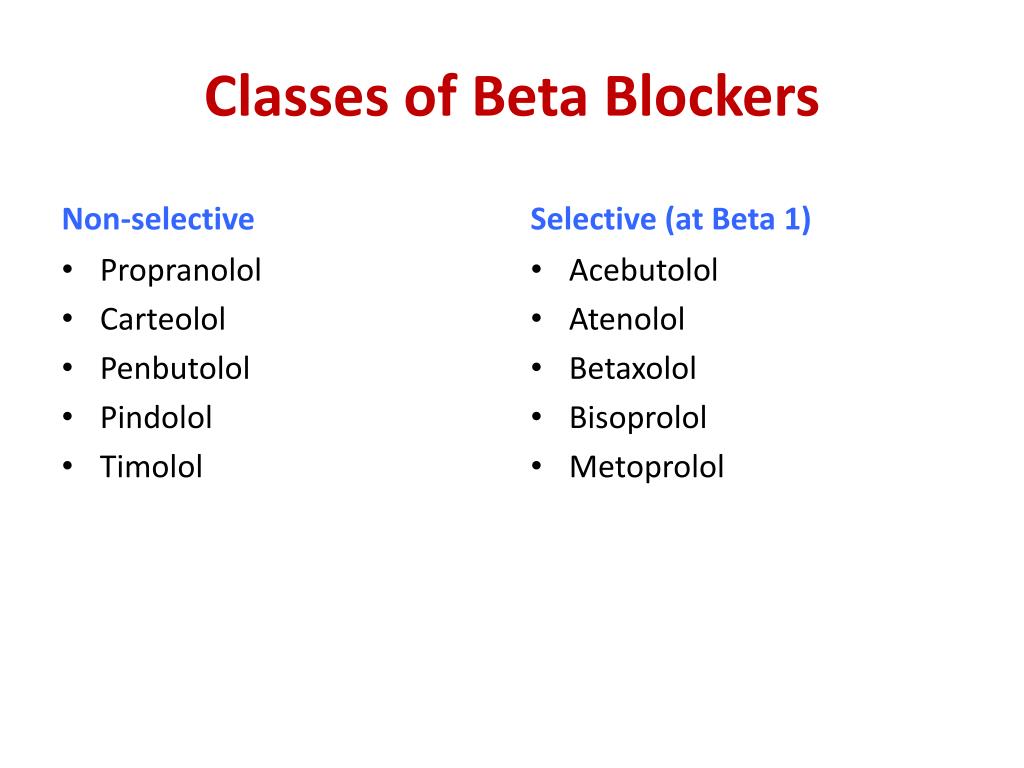 Classes of Beta Blockers Non-selective Selective (at Beta 1) Acebutolol Atenolol Betaxolol Bisoprolol Metoprolol • Propranolol • Carteolol • Penbutolol • Pindolol • Timolol