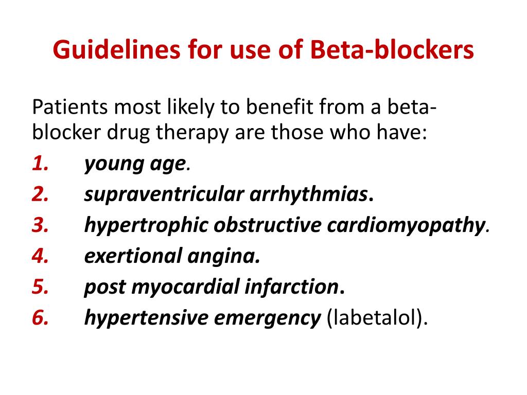 Guidelines for use of Beta-blockers Patients most likely to benefit from a beta-blocker drug therapy are those who have: • youngage. • supraventricular arrhythmias. • hypertrophic obstructive cardiomyopathy. • exertionalangina. • post myocardial infarction. • hypertensive emergency (labetalol).