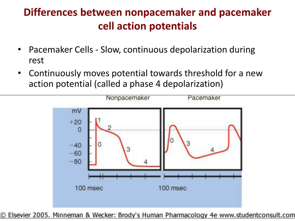 Differences between nonpacemaker and pacemaker cell action potentials • Pacemaker Cells - Slow, continuous depolarization during rest • Continuously moves potential towards threshold for a new action potential (called a phase 4 depolarization)