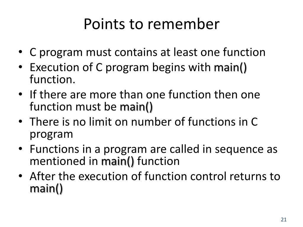 Points to remember C program must contains at least one function Execution of C program begins with main() function. If there are more than one function then one function must be main() There is no limit on number of functions in C program Functions in a program are called in sequence as mentioned in main() function After the execution of function control returns to main()