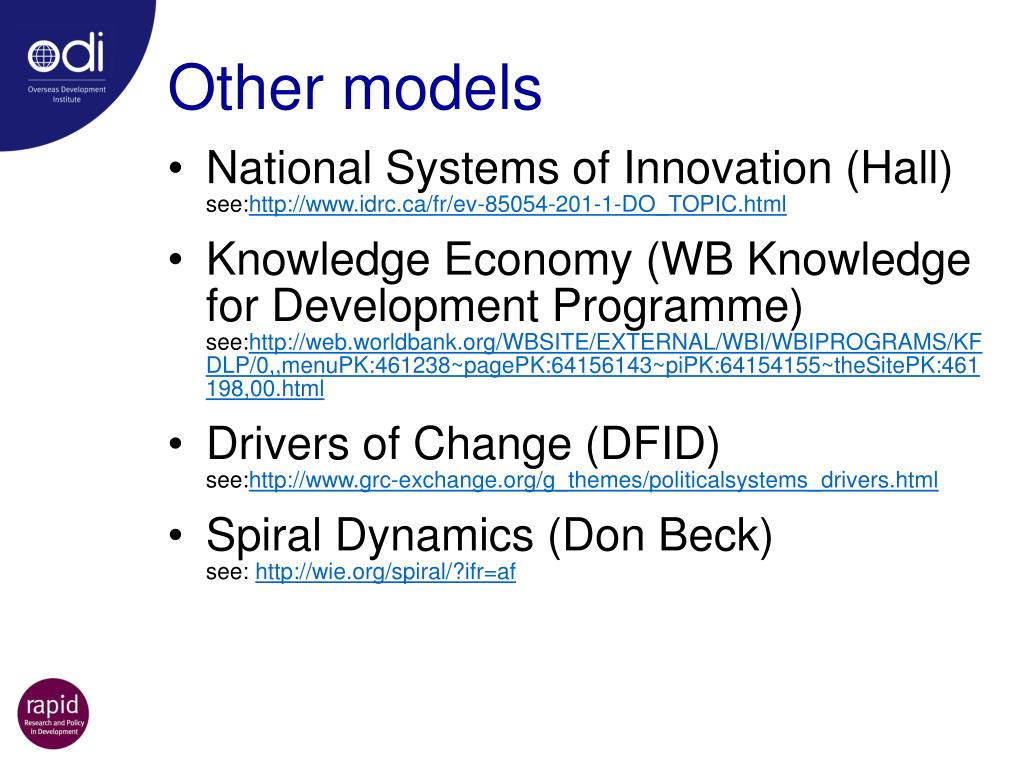 Other models • National Systems of Innovation (Hall) see:http://www.idrc.ca/fr/ev-85054-201-1-DO_TOPIC.html • Knowledge Economy (WB Knowledge for Development Programme)see:http://web.worldbank.org/WBSITE/EXTERNAL/WBI/WBIPROGRAMS/KFDLP/0,,menuPK:461238~pagePK:64156143~piPK:64154155~theSitePK:461198,00.html • Drivers of Change (DFID)see:http://www.grc-exchange.org/g_themes/politicalsystems_drivers.html • Spiral Dynamics (Don Beck)see: http://wie.org/spiral/?ifr=af