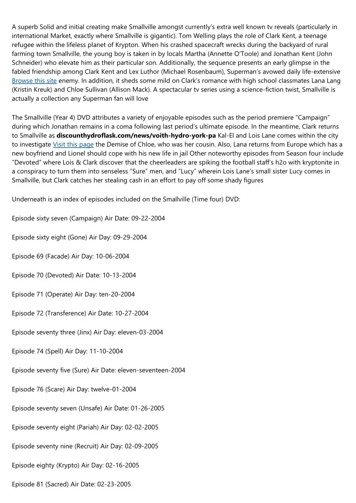 A superb Solid and initial creating make Smallville amongst currently’s extra well known tv reveals (particularly in international Market, exactly where Smallville is gigantic). Tom Welling plays the role of Clark Kent, a teenage refugee within the lifeless planet of Krypton. When his crashed spacecraft wrecks during the backyard of rural farming town Smallville, the young boy is taken in by locals Martha (Annette O’Toole) and Jonathan Kent (John Schneider) who elevate him as their particular son. Additionally, the sequence presents an early glimpse in the fabled friendship among Clark Kent and Lex Luthor (Michael Rosenbaum), Superman’s avowed daily life-extensive Browse this site enemy. In addition, it sheds some mild on Clark’s romance with high school classmates Lana Lang (Kristin Kreuk) and Chloe Sullivan (Allison Mack). A spectacular tv series using a science-fiction twist, Smallville is actually a collection any Superman fan will love The Smallville (Year 4) DVD attributes a variety of enjoyable episodes such as the period premiere “Campaign” during which Jonathan remains in a coma following last period’s ultimate episode. In the meantime, Clark returns to Smallville as discounthydroflask.com/news/voith-hydro-york-pa Kal-El and Lois Lane comes within the city to investigate Visit this page the Demise of Chloe, who was her cousin. Also, Lana returns from Europe which has a new boyfriend and Lionel should cope with his new life in jail Other noteworthy episodes from Season four include “Devoted” where Lois & Clark discover that the cheerleaders are spiking the football staff’s h2o with kryptonite in a conspiracy to turn them into senseless “Sure” men, and “Lucy” wherein Lois Lane’s small sister Lucy comes in Smallville, but Clark catches her stealing cash in an effort to pay off some shady figures Underneath is an index of episodes included on the Smallville (Time four) DVD: Episode sixty seven (Campaign) Air Date: 09-22-2004 Episode sixty eight (Gone) Air Day: 09-29-2004 Episode 69 (Facade) Air Day: 10-06-2004 Episode 70 (Devoted) Air Date: 10-13-2004 Episode 71 (Operate) Air Day: ten-20-2004 Episode 72 (Transference) Air Date: 10-27-2004 Episode seventy three (Jinx) Air Day: eleven-03-2004 Episode 74 (Spell) Air Day: 11-10-2004 Episode seventy five (Sure) Air Date: eleven-seventeen-2004 Episode 76 (Scare) Air Day: twelve-01-2004 Episode seventy seven (Unsafe) Air Date: 01-26-2005 Episode seventy eight (Pariah) Air Day: 02-02-2005 Episode seventy nine (Recruit) Air Day: 02-09-2005 Episode eighty (Krypto) Air Day: 02-16-2005 Episode 81 (Sacred) Air Date: 02-23-2005