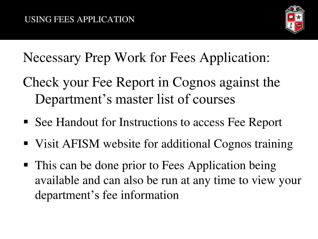 USING FEES APPLICATION • Necessary Prep Work for Fees Application: • Check your Fee Report in Cognos against the Department’s master list of courses • See Handout for Instructions to access Fee Report • Visit AFISM website for additional Cognos training • This can be done prior to Fees Application being available and can also be run at any time to view your department’s fee information
