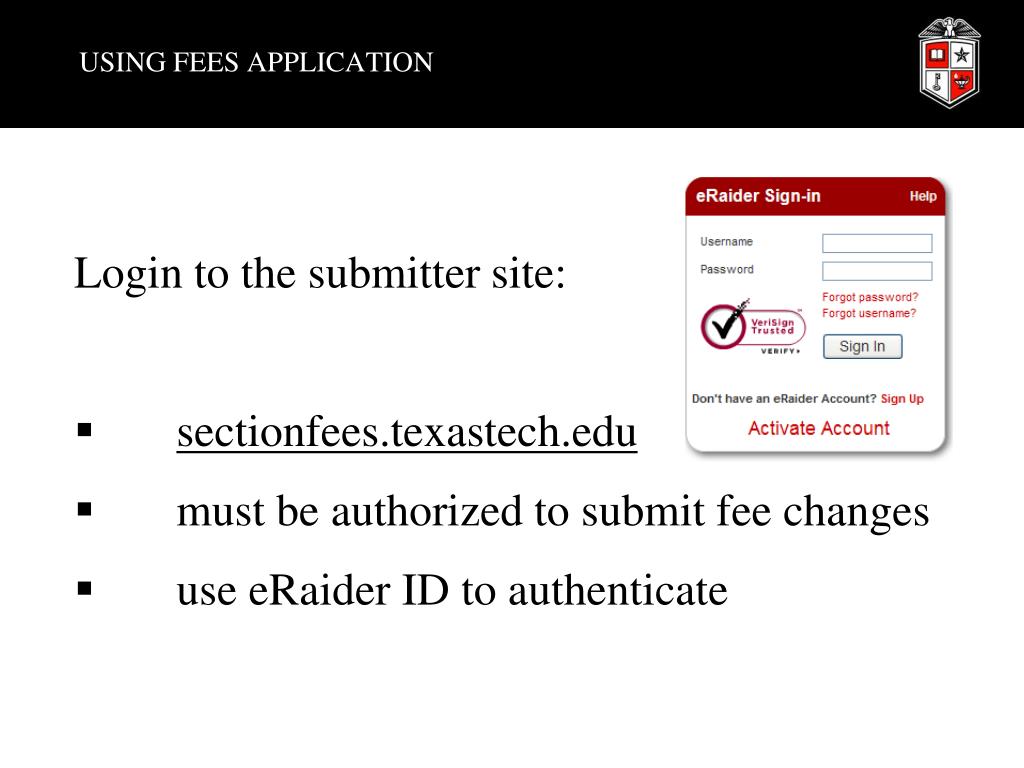USING FEES APPLICATION • Login to the submitter site: • sectionfees.texastech.edu • must be authorized to submit fee changes • use eRaider ID to authenticate