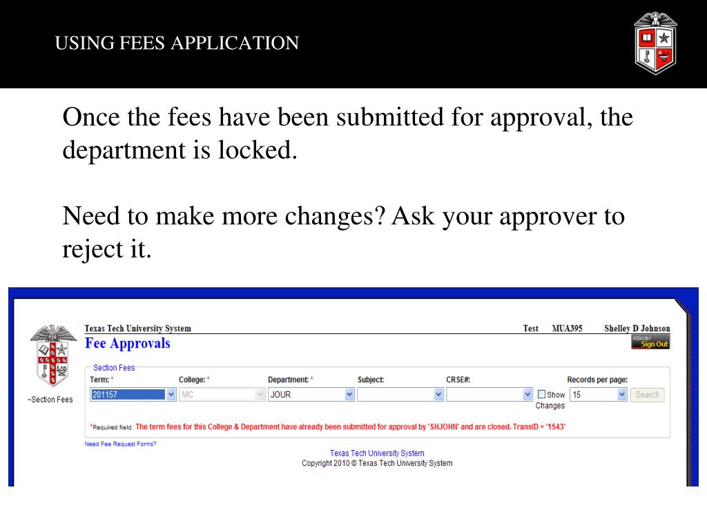 USING FEES APPLICATION Once the fees have been submitted for approval, the department is locked. Need to make more changes? Ask your approver to reject it.