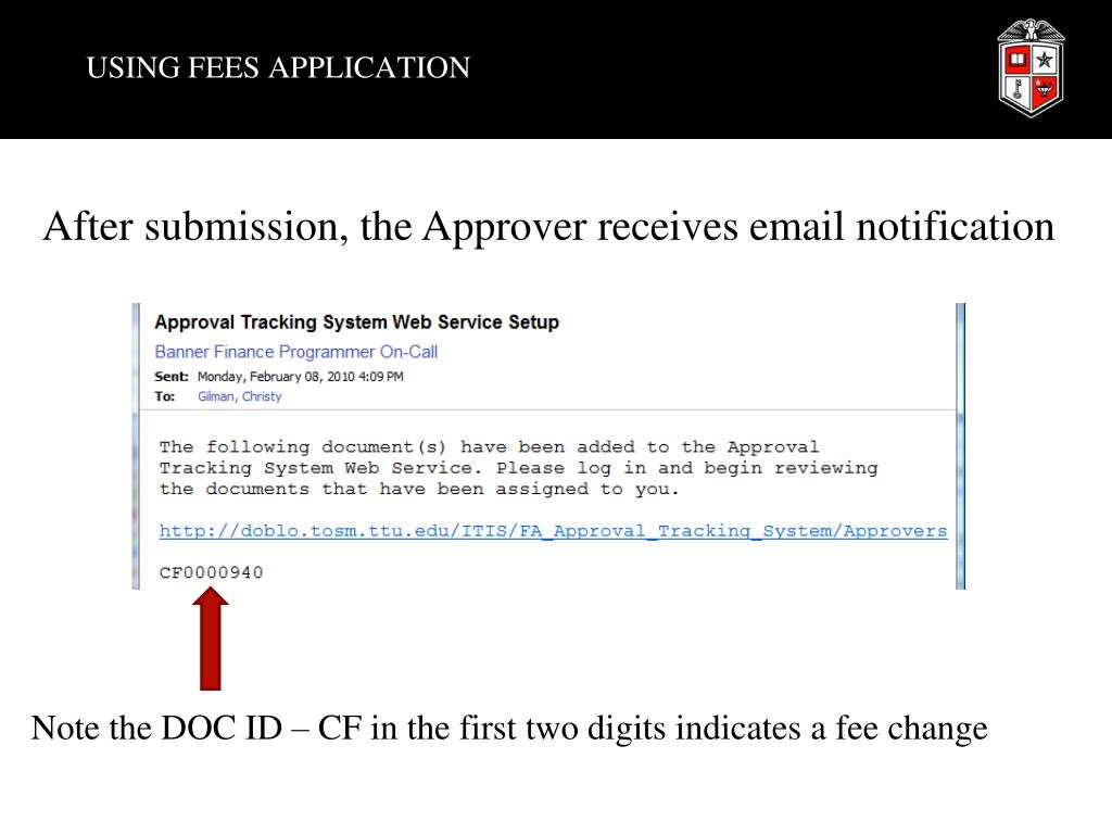 USING FEES APPLICATION After submission, the Approver receives email notification Note the DOC ID – CF in the first two digits indicates a fee change