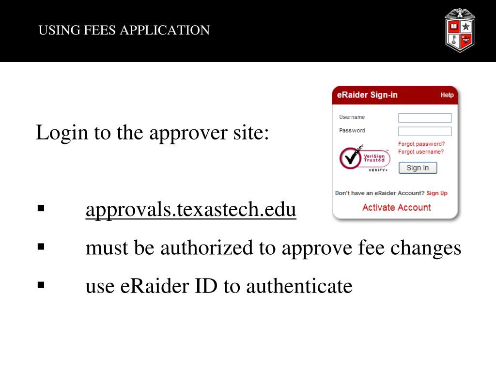 USING FEES APPLICATION • Login to the approver site: • approvals.texastech.edu • must be authorized to approve fee changes • use eRaider ID to authenticate