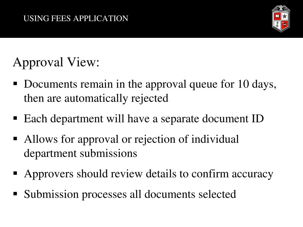 USING FEES APPLICATION • Approval View: • Documents remain in the approval queue for 10 days, then are automatically rejected • Each department will have a separate document ID • Allows for approval or rejection of individual department submissions • Approvers should review details to confirm accuracy • Submission processes all documents selected
