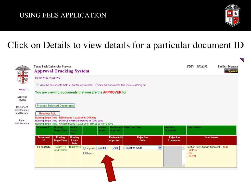 USING FEES APPLICATION • Click on Details to view details for a particular document ID