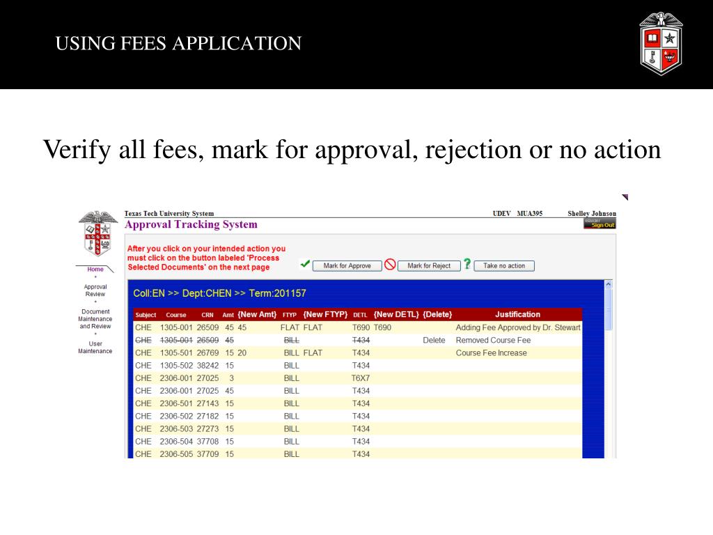 USING FEES APPLICATION Verify all fees, mark for approval, rejection or no action