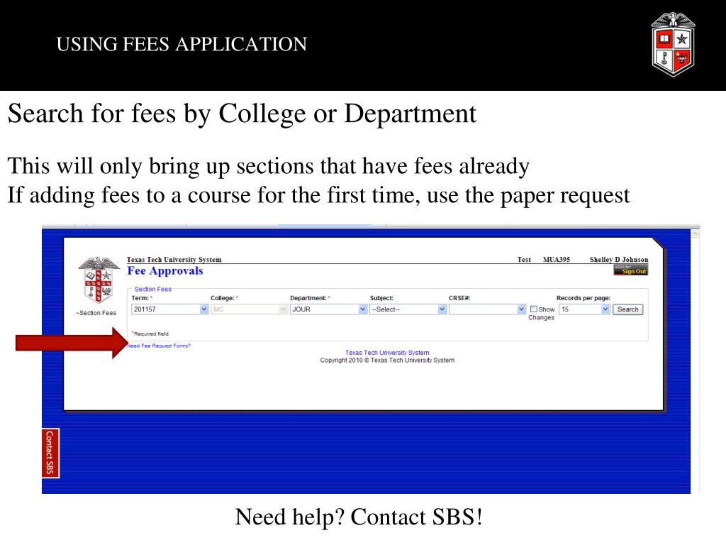 USING FEES APPLICATION Search for fees by College or Department This will only bring up sections that have fees already If adding fees to a course for the first time, use the paper request Need help? Contact SBS!