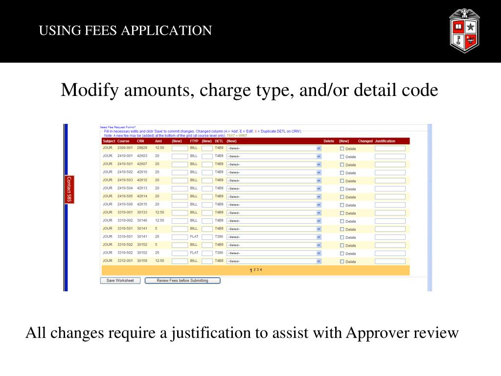USING FEES APPLICATION Modify amounts, charge type, and/or detail code All changes require a justification to assist with Approver review