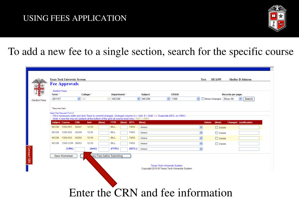 USING FEES APPLICATION • To add a new fee to a single section, search for the specific course Enter the CRN and fee information