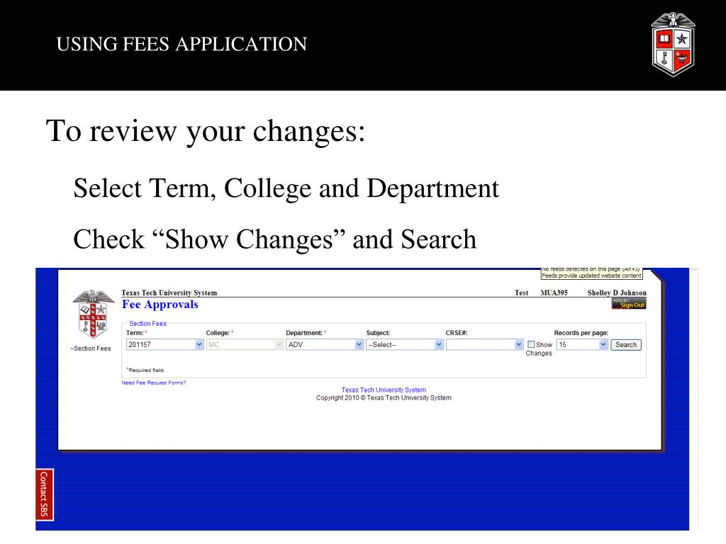 USING FEES APPLICATION • To review your changes: • Select Term, College and Department • Check “Show Changes” and Search