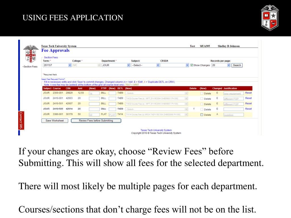 FEES APPLICATION GENERAL INFORMATION • Translating term codes: • 20XX YZ • XX = Fiscal Year • Y = Term • Fall = 2 • Spring = 5 • First Summer/Intercession/Full Summer = 8 • Second Summer = 9 • Z = School • TTU = 7 • Law = 8