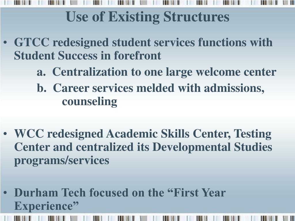 Use of Existing Structures • GTCC redesigned student services functions with Student Success in forefront a. Centralization to one large welcome center b. Career services melded with admissions, counseling • WCC redesigned Academic Skills Center, Testing Center and centralized its Developmental Studies programs/services • Durham Tech focused on the “First Year Experience”