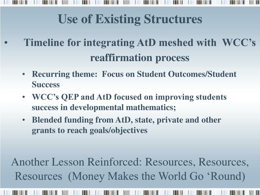 Use of Existing Structures • Timeline for integrating AtD meshed with WCC’s reaffirmation process • Recurring theme: Focus on Student Outcomes/Student Success • WCC’s QEP and AtD focused on improving students success in developmental mathematics; • Blended funding from AtD, state, private and other grants to reach goals/objectives Another Lesson Reinforced:Resources, Resources, Resources (Money Makes the World Go ‘Round)