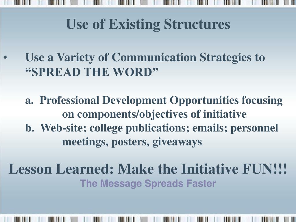 Use of Existing Structures • Use a Variety of Communication Strategies to “SPREAD THE WORD”a. Professional Development Opportunities focusing on components/objectives of initiativeb. Web-site; college publications; emails; personnel meetings, posters, giveaways Lesson Learned: Make the Initiative FUN!!! The Message Spreads Faster