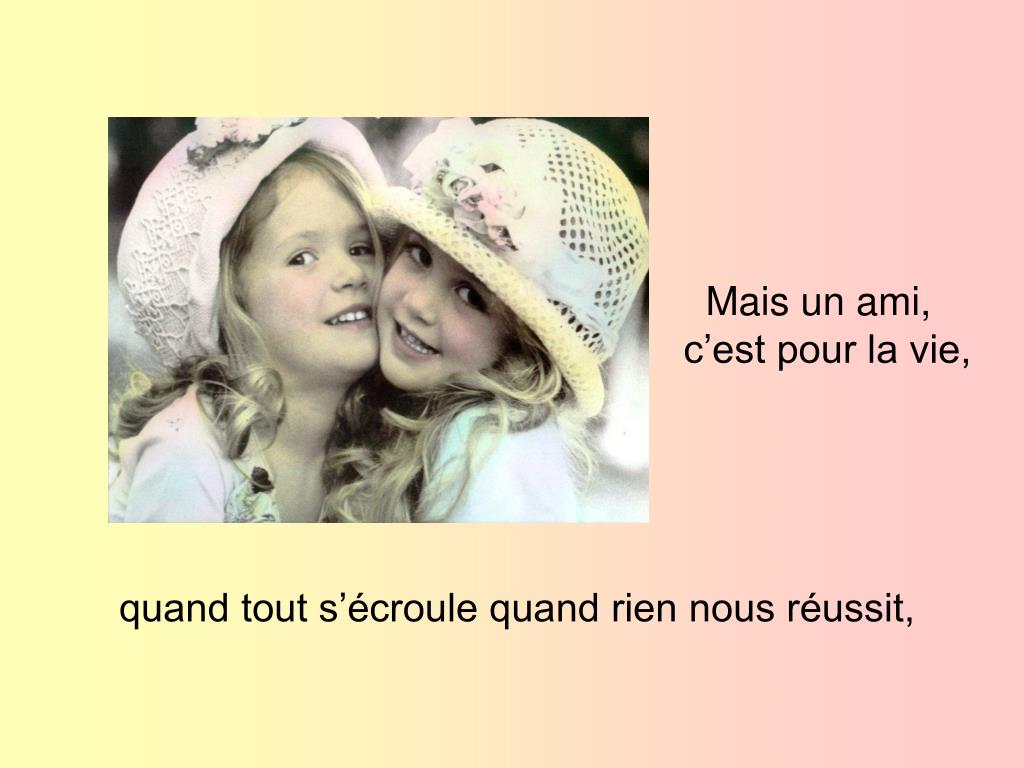 Mais un ami, c’est pour la vie… quand tout s’écroule, quand rien nous réussit,