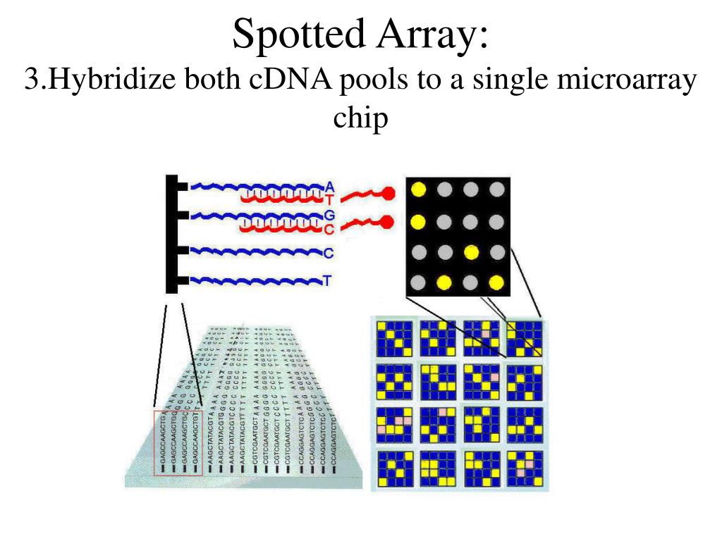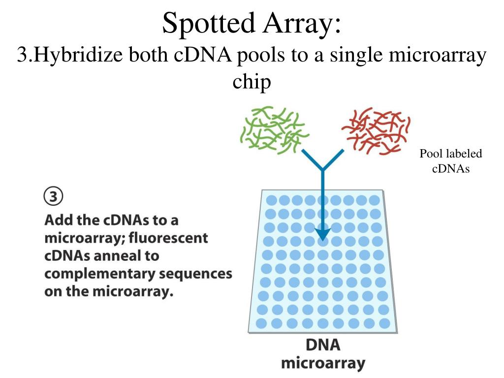 Spotted Array: 3.Hybridize both cDNA pools to a single microarray chip Pool labeled cDNAs