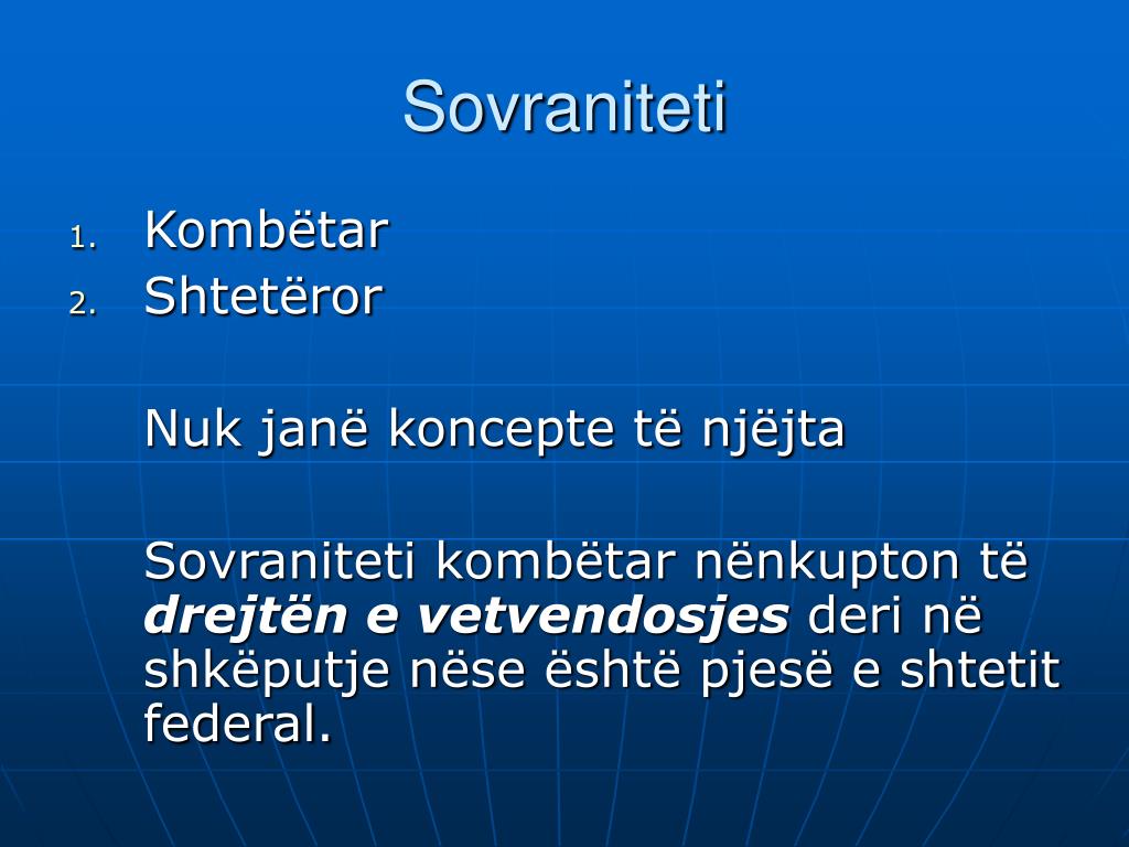 Sovraniteti • Kombëtar • Shtetëror Nuk janë koncepte të njëjta Sovraniteti kombëtar nënkupton të drejtën e vetvendosjes deri në shkëputje nëse është pjesë e shtetit federal.