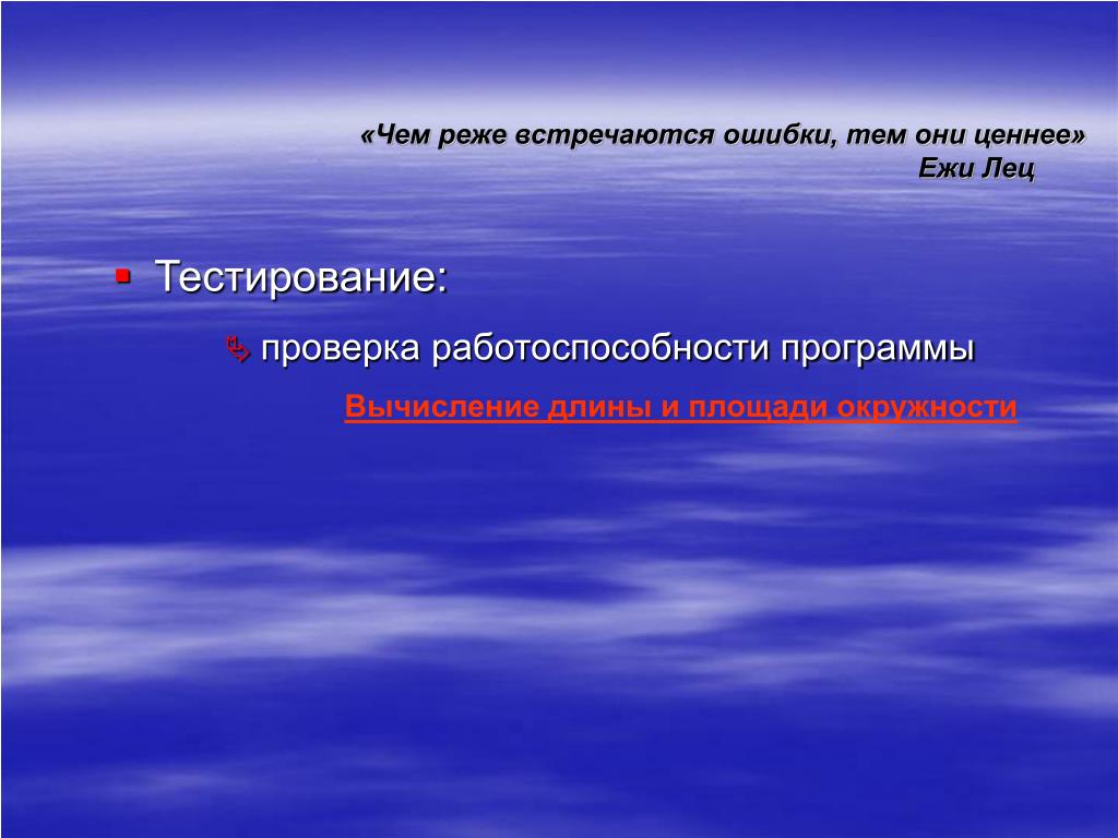 «Чем реже встречаются ошибки, тем они ценнее»Ежи Лец • Тестирование: • проверка работоспособности программы Вычисление длины и площади окружности