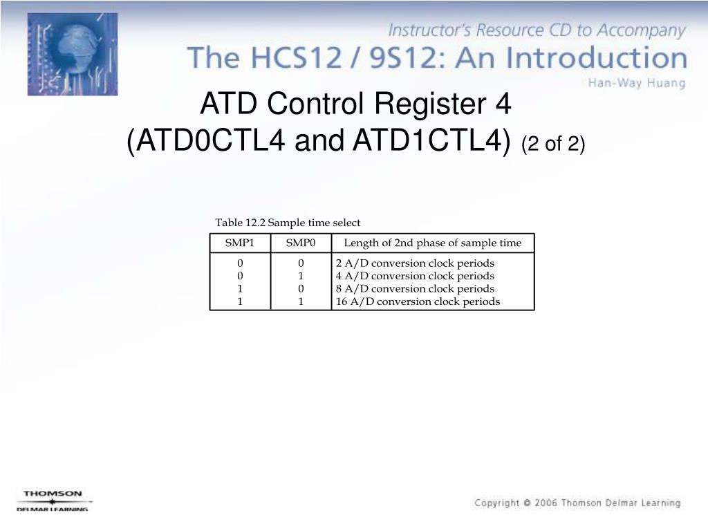 ATD Control Register 4 (ATD0CTL4 and ATD1CTL4) (1 of 2) • This register sets the conversion clock frequency, the length of the second phase of the sample time, and the resolution of the A/D conversion. • Writes to this register will abort the current conversion. • There are two stages in the sample time. The first stage sample time is fixed at two conversion clock period. The second stage is selected by SMP1 and SMP2 bits of this register.