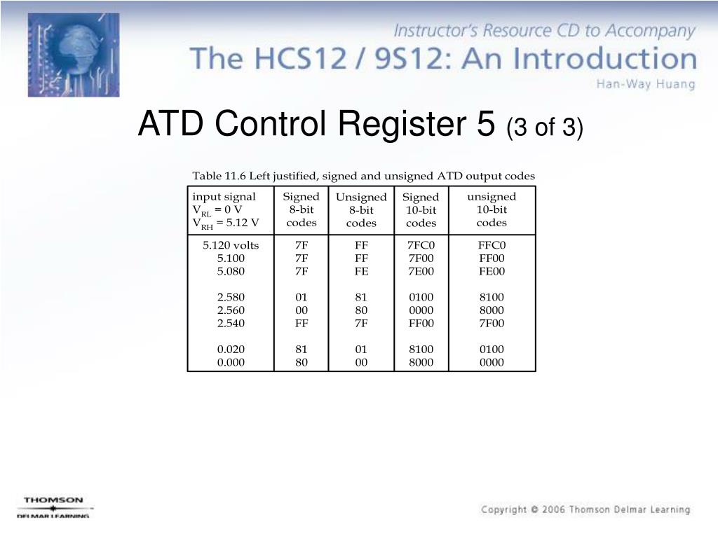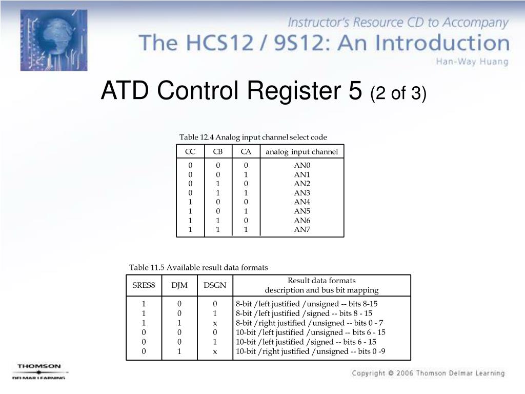 ATD Control Register 5 (1 of 3) • Selects the type of conversion sequence and the analog input channels to be sampled. • Writes to this register will abort the current conversion. • Table 12.4 selects the channel to be converted. • Table 12.5 summarizes the result data formats available and how they are set up using the control bits. • Table 12.6 illustrates the difference between the signed and unsigned, left justified and right justified output codes for an input signal range between 0 and 5.12V.