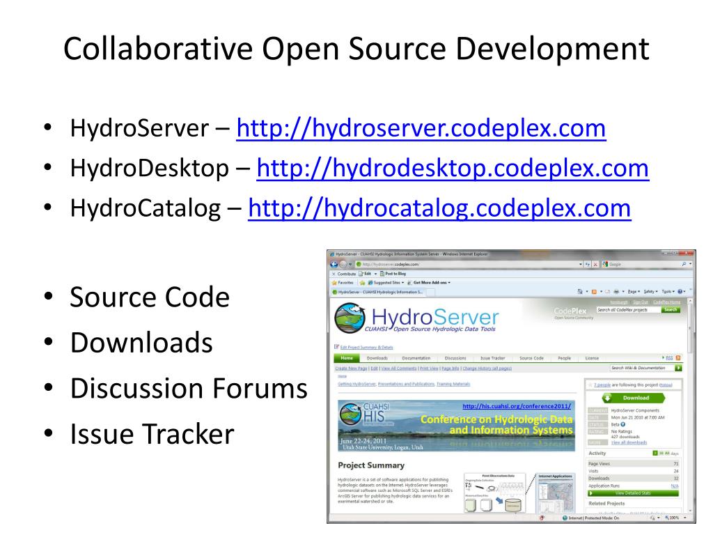 Collaborative Open Source Development • HydroServer – http://hydroserver.codeplex.com • HydroDesktop – http://hydrodesktop.codeplex.com • HydroCatalog – http://hydrocatalog.codeplex.com • Source Code • Downloads • Discussion Forums • Issue Tracker