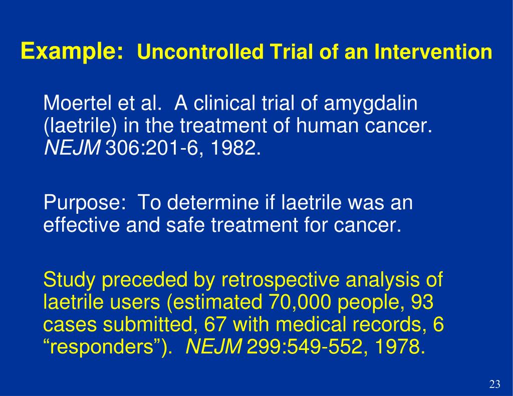 Example: Uncontrolled Trial of an Intervention Moertel et al. A clinical trial of amygdalin (laetrile) in the treatment of human cancer. NEJM 306:201-6, 1982. Purpose: To determine if laetrile was an effective and safe treatment for cancer. Study preceded by retrospective analysis of laetrile users (estimated 70,000 people, 93 cases submitted, 67 with medical records, 6 “responders”). NEJM 299:549-552, 1978.