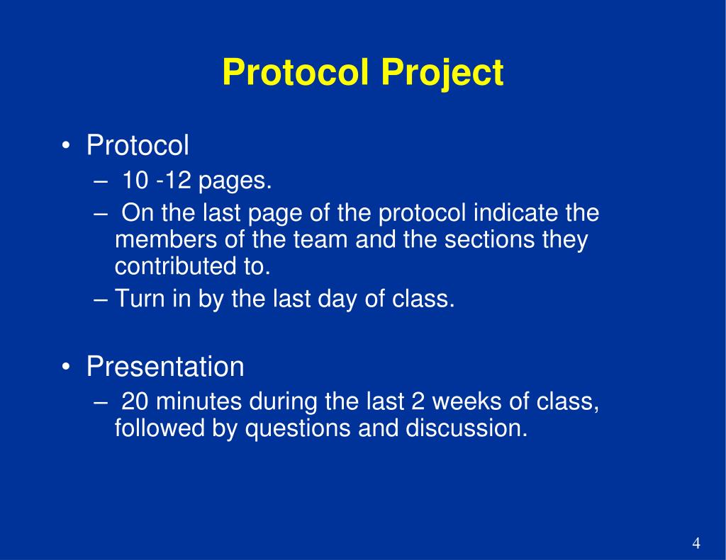 Protocol Project • Protocol • 10 -12 pages. • On the last page of the protocol indicate the members of the team and the sections they contributed to. • Turn in by the last day of class. • Presentation • 20 minutes during the last 2 weeks of class, followed by questions and discussion.