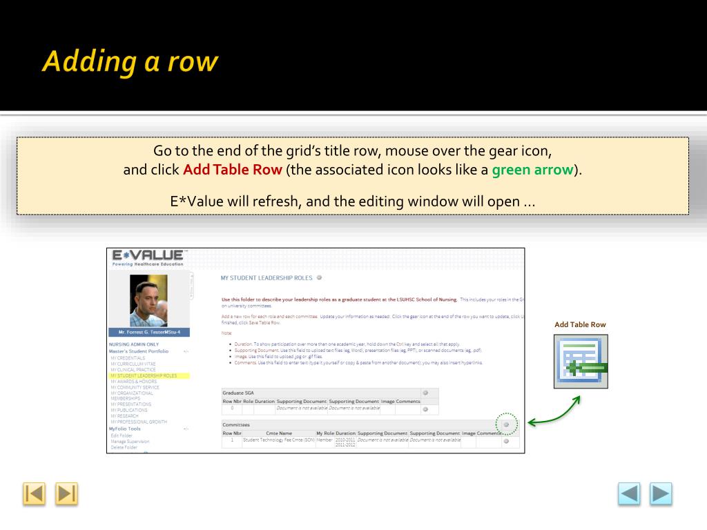 Adding a row Go to the end of the grid’s title row, mouse over the gear icon, and click Add Table Row (the associated icon looks like a greenarrow). E*Value will refresh, and the editing window will open … Add Table Row