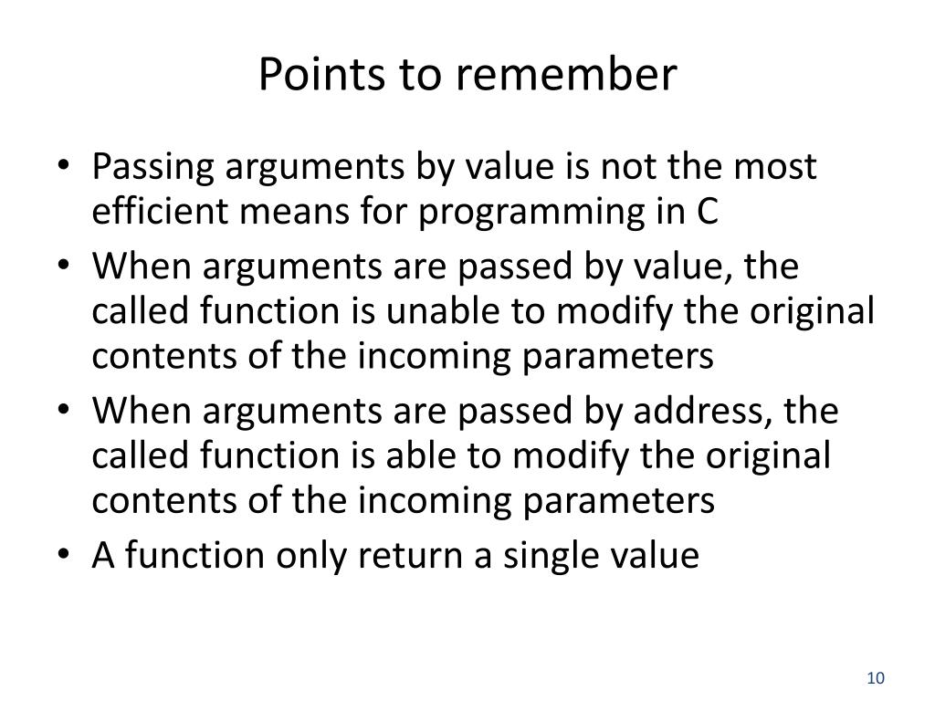 Points to remember Passing arguments by value is not the most efficient means for programming in C When arguments are passed by value, the called function is unable to modify the original contents of the incoming parameters When arguments are passed by address, the called function is able to modify the original contents of the incoming parameters A function only return a single value