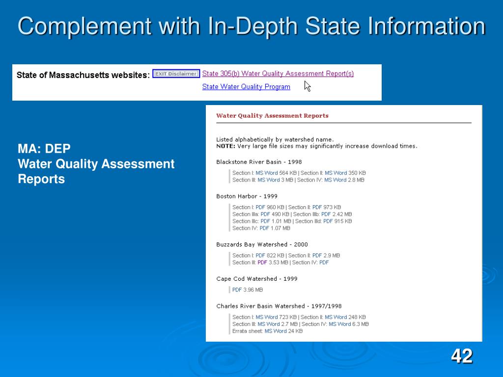 Complement with In-Depth State Information MA: DEP Water Quality Assessment Reports