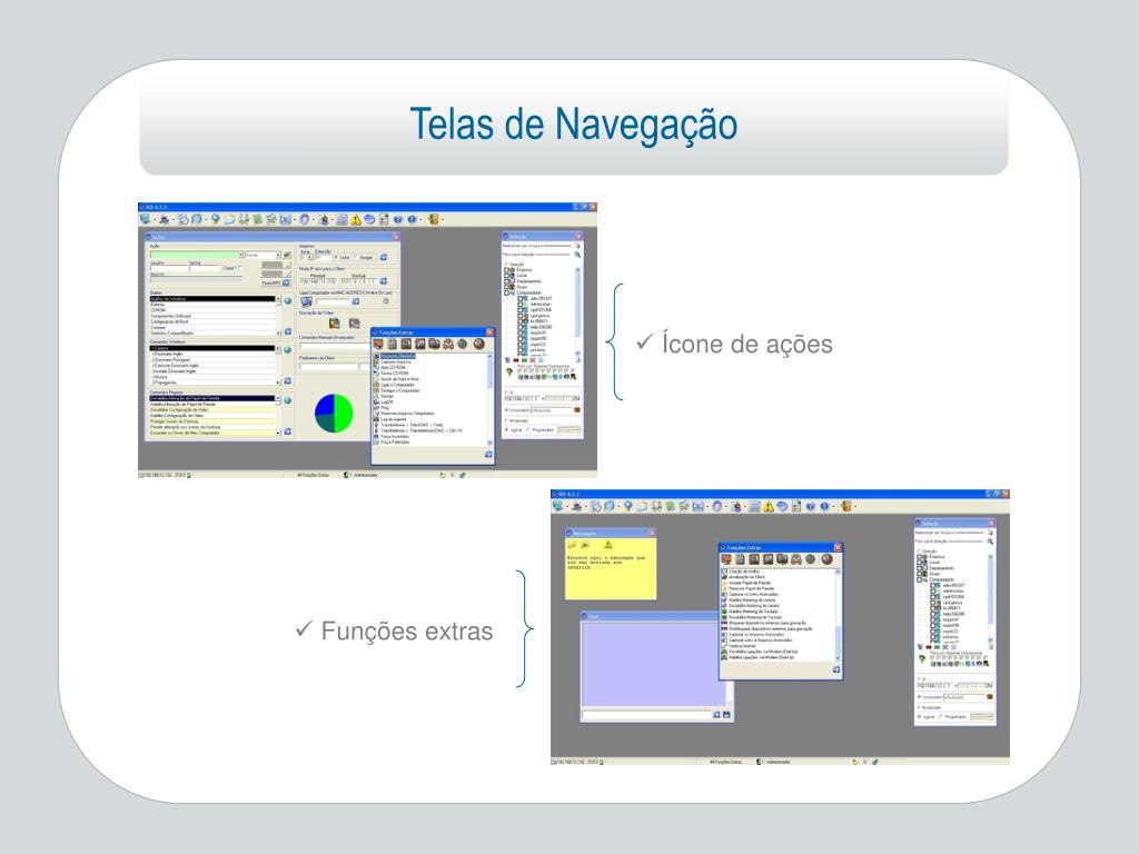 Telas de Navegação • Gerador de novos relatórios • Central de Alertas