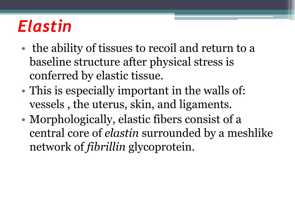 Elastin • the ability of tissues to recoil and return to a baseline structure after physical stress is conferred by elastic tissue. • This is especially important in the walls of: vessels , the uterus, skin, and ligaments. • Morphologically, elastic fibers consist of a central core of elastin surrounded by a meshlike network of fibrillin glycoprotein.