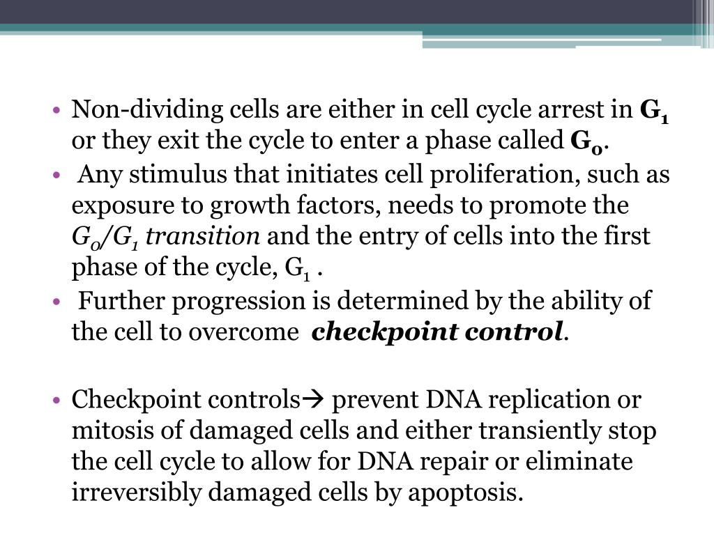 Non-dividing cells are either in cell cycle arrest in G1 or they exit the cycle to enter a phase called G0. • Any stimulus that initiates cell proliferation, such as exposure to growth factors, needs to promote the G0/G1 transition and the entry of cells into the first phase of the cycle, G1 . • Further progression is determined by the ability of the cell to overcome checkpointcontrol. • Checkpoint controls prevent DNA replication or mitosis of damaged cells and either transiently stop the cell cycle to allow for DNA repair or eliminate irreversibly damaged cells by apoptosis.