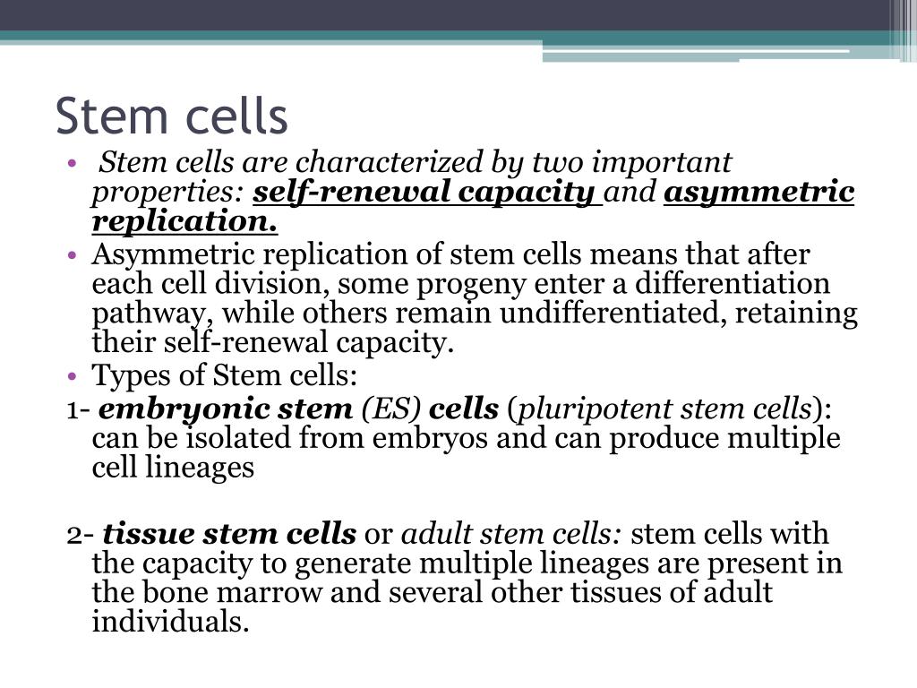 Stem cells • Stem cells are characterized by two important properties: self-renewalcapacityand asymmetric replication. • Asymmetric replication of stem cells means that after each cell division, some progeny enter a differentiation pathway, while others remain undifferentiated, retaining their self-renewal capacity. • Types of Stem cells: 1- embryonicstem (ES) cells(pluripotent stem cells): can be isolated from embryos and can produce multiple cell lineages 2- tissuestemcells or adult stem cells: stem cells with the capacity to generate multiple lineages are present in the bone marrow and several other tissues of adult individuals.