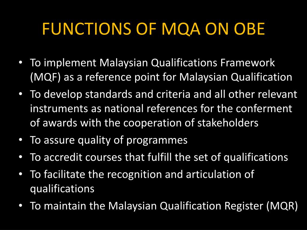 FUNCTIONS OF MQA ON OBE • To implement Malaysian Qualifications Framework (MQF) as a reference point for Malaysian Qualification • To develop standards and criteria and all other relevant instruments as national references for the conferment of awards with the cooperation of stakeholders • To assure quality of programmes • To accredit courses that fulfill the set of qualifications • To facilitate the recognition and articulation of qualifications • To maintain the Malaysian Qualification Register (MQR)