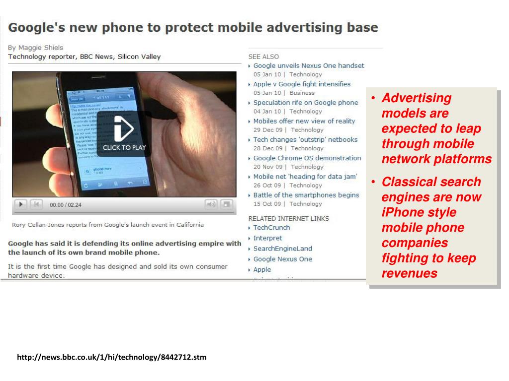 Advertising models are expected to leap through mobile network platforms • Classical search engines are now iPhone style mobile phone companies fighting to keep revenues http://news.bbc.co.uk/1/hi/technology/8442712.stm