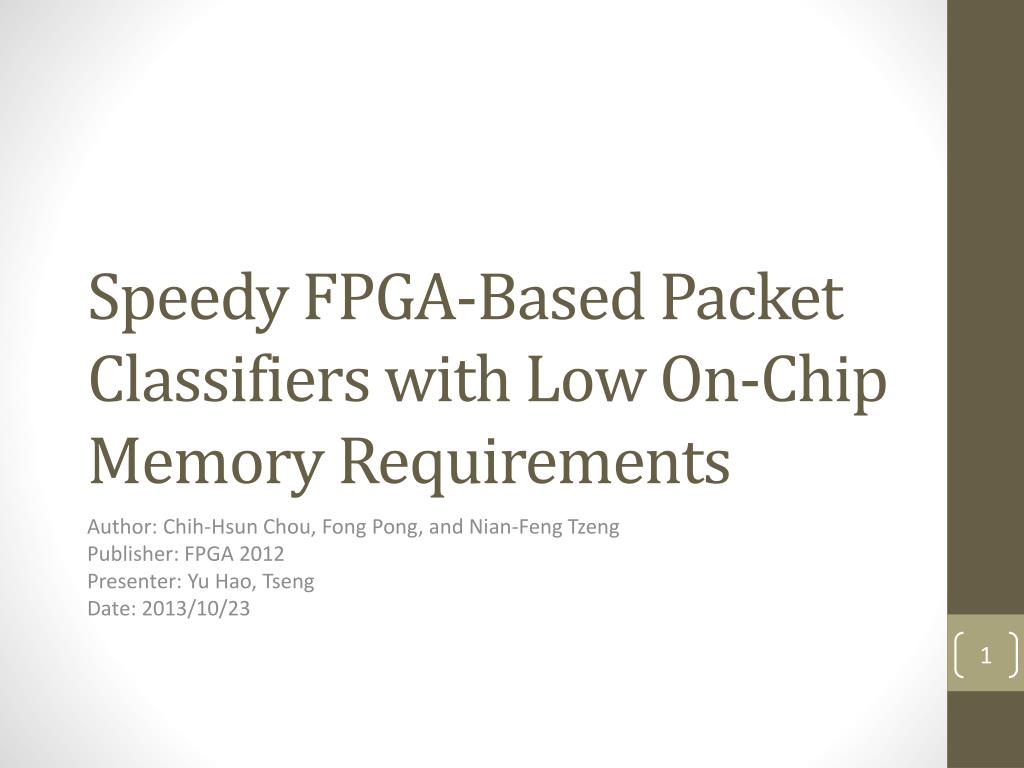 Speedy FPGA-Based Packet Classifiers with Low On-Chip Memory Requirements Author: Chih-HsunChou, Fong Pong, and Nian-FengTzeng Publisher: FPGA 2012 Presenter: Yu Hao, Tseng Date: 2013/10/23