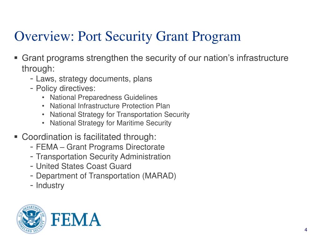 Overview: Port Security Grant Program • Grant programs strengthen the security of our nation’s infrastructure through: • Laws, strategy documents, plans • Policy directives: • National Preparedness Guidelines • National Infrastructure Protection Plan • National Strategy for Transportation Security • National Strategy for Maritime Security • Coordination is facilitated through: • FEMA – Grant Programs Directorate • Transportation Security Administration • United States Coast Guard • Department of Transportation (MARAD) • Industry